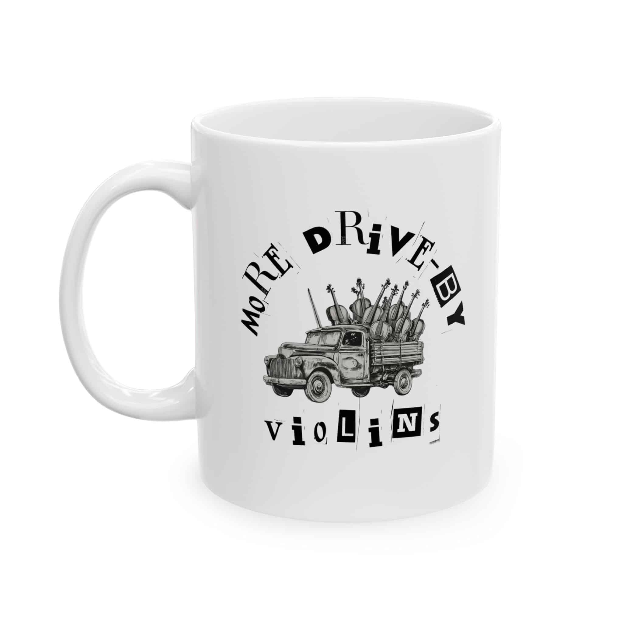 The More Drive-By Violins graphic adds a playful and artistic element to your mug, making it a great conversation starter and a unique gift for music lovers and art enthusiasts alike.